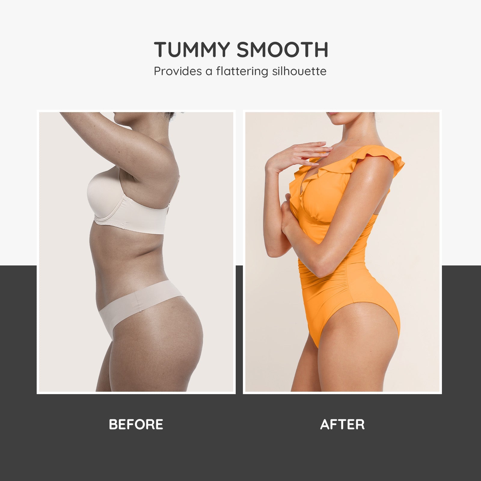 Der verspielte Rüschen-V-Ausschnitt schmeichelt dem Dekolleté, während Raffungen an der Taille kleine Unebenheiten elegant kaschieren. Ein elastisches Unterbrustband bietet zusätzlichen Halt für eine sichere, komfortable Passform